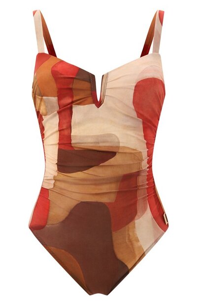 Слитный купальник Classic с размытым абстрактным принтом сшили из быстросохнущей лайкры. Модель с V-образным вырезом между формованными чашечками на косточках и широкими регулируемыми бретелями украсили вертикальными драпировками, подчеркивающими силуэт.