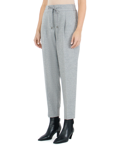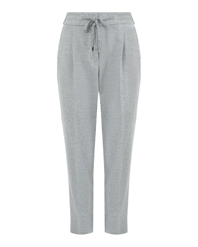 Эти брюки — воплощение современного стиля и утонченной элегантности. Выполненные из мягкой ткани светло-серого оттенка, они идеально сочетают в себе комфорт и элегантность, создавая беспроигрышный вариант для любого гардероба. Укороченный крой и слегка зауженные штанины формируют изящный и вытянутый силуэт. Эластичный пояс дополнен завязками-лентами, обеспечивая индивидуальную посадку и добавляя непринужденную нотку к образу. Небольшие защипы спереди создают легкость и объем, подчеркивая непринужденность и свободу движений. Классическая посадка облегчает комбинирование с разными элементами гардероба, будь то блузки или уютные свитеры. Аккуратная отделка швов и лаконичная фурнитура свидетельствуют о высоком стандарте качества и внимании к деталям. Эти брюки станут основой для создания стильных и современных образов, подчеркивая вашу индивидуальность и чувство стиля.