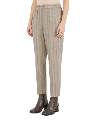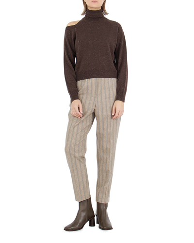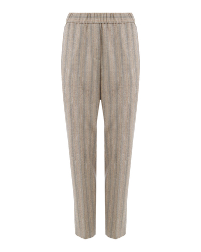 Эти брюки — идеальное сочетание уюта и изысканности, воплощение стильного повседневного шика. Сшитые из приятного на ощупь материала с теплой текстурой, они обеспечивают непревзойденное удобство и комфорт. Интересный узор в вертикальную полоску визуально вытягивает силуэт, добавляет динамичности и структурности. Это решение делает брюки подходящими как для офисного стиля, так и для непринужденных прогулок. Эластичный пояс подчеркивает талию и гарантирует превосходную посадку, а также обеспечивает свободу движений. Это делает модель особенно удобной для активного образа жизни. Брюки оформлены аккуратными швами, которые подчеркивают внимательность к деталям и профессионализм исполнения. Завершает образ лёгкий конусообразный крой, который создает изящный и упаковочный вид. Эти брюки не только подчеркнут вашу индивидуальность, но и станут центральным элементом в создании как элегантного, так и повседневного образа, привнося чувство стиля и уверенности в каждый шаг.