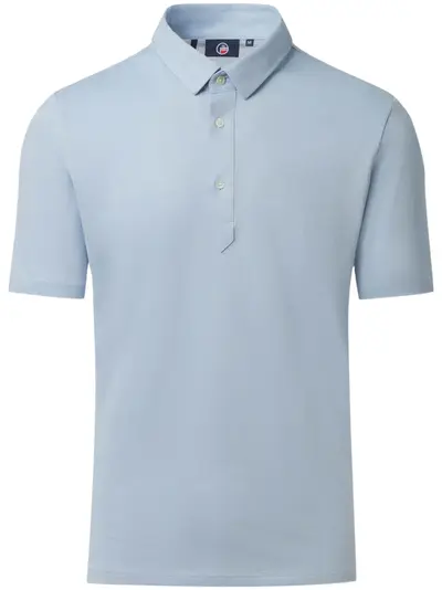 light blue front button placket polo collar short sleeves logo patch at the sleeve