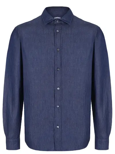 -Синяя рубашка из легкого хлопкового денима от JACOB COHEN. -Модель прямого кроя с длинными рукавами, манжетами, отложным воротником, застежкой на пуговицы.