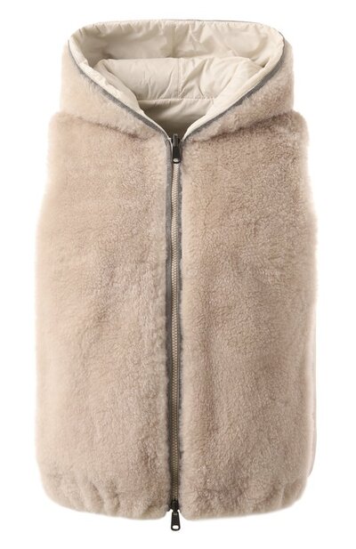 Двусторонний жилет с боковыми карманами и эластичным поясом сшили из овчины и тафты на основе хлопка. Края капюшона и молнию дополнили декором Precious Trim, для изготовления которого потребовалось около четырех метров фирменной цепочки мониль. Модель, утепленную наполнителем Thermore®, можно вывернуть и носить нейлоновой стороной наружу.