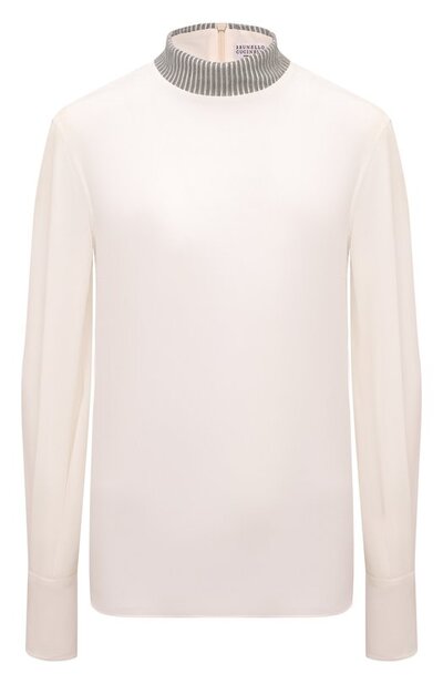 Блузу с длинными рукавами и манжетами рубашечного типа выполнили из шелка. Фирменной цепочкой мониль воротник-стойку сделали похожим на связанный английской резинкой. Сзади — потайная молния.
