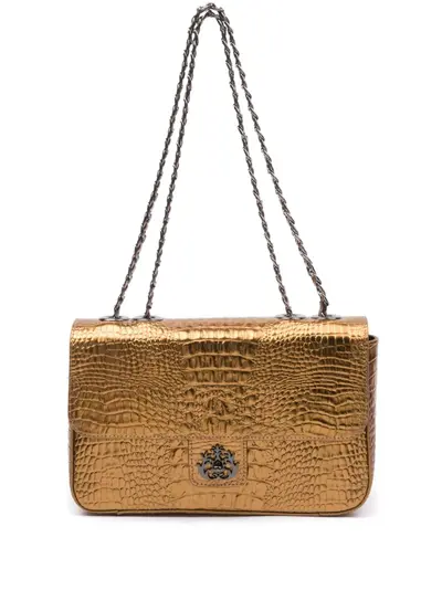 gold-tone foldover top two chain-link shoulder straps main compartment embossed crocodile effect