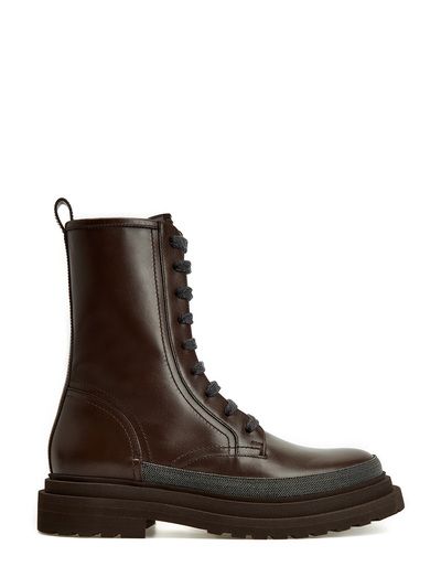 Эффектные ботинки в стиле милитари от Brunello Cucinelli созданы из гладкой телячьей кожи Mat и дополнены ценными деталями. Вышивка нитями блестящей цепочки Мониль подчеркивает спортивный силуэт и завершает модель изящным женственным акцентом. Двойная застежка на шнурки из ткани и боковую молнию позволяет легко снимать и надевать обувь. Сделано в Италии.