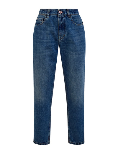 Джинсы Baggy от Brunello Cucinelli сочетают современный свободный силуэт и фирменные детали. Модель создана из полностью натурального хлопкового денима, окрашенного мастерами бренда в готовом виде. Мерцающий штрих — деталь из ювелирных бусин Мониль без содержания никеля на кармане. Детали: пять карманов, нашивка из кожи. Сделано в Италии.