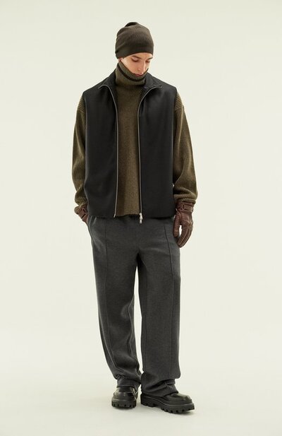 Свободный шерстяной свитер с двойным воротником-стойкой и спущенной линией плеч выполнили ребристой вязкой. Спинку дополнили нашивкой с логотипом марки.