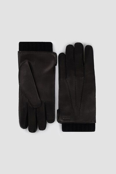 Кожаные перчатки чёрного цвета от Zilli. Модель с рельефной дизайнерской строчкой-узором на тыльной стороне отличается наличием трикотажной манжеты-резинки, которая плотно облегает и не пропускает холод внутрь. Принадлежность классического аксессуара Дому обозначена небольшим тиснёным логотипом на запястье.