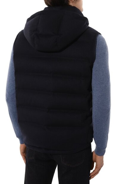 Стеганый жилет на гусином пуху, сертифицированном EDFA, сшили из мембранной шерстяной фланели. Модель со съемным регулируемым капюшоном, двумя внешними и двумя внутренними карманами и держателем для ручки застегивается встречной молнией с прорезиненным кантом.