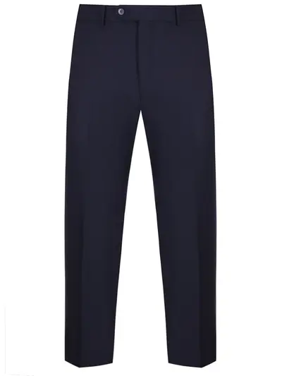 -Синие классические брюки из тонкой шерсти от LUBIAM. -Модель стандартного кроя и посадки с поясом со шлевками, прорезными карманами, застежкой на молнию и пуговицу, графичными стрелками, которые визуально вытягивают силуэт.