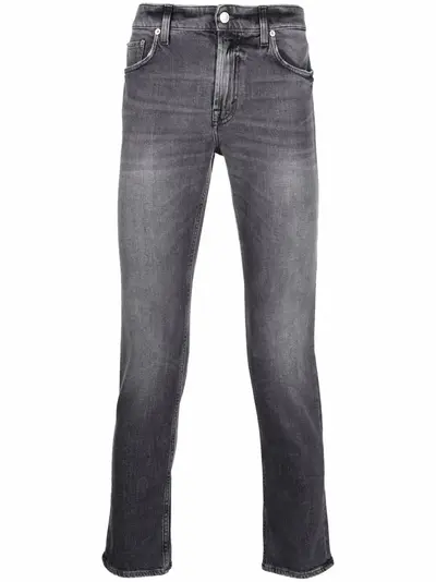 grey cotton blend button fly fastening belt loops classic five pockets whiskering effect faded effect logo patch to the rear skinny cut