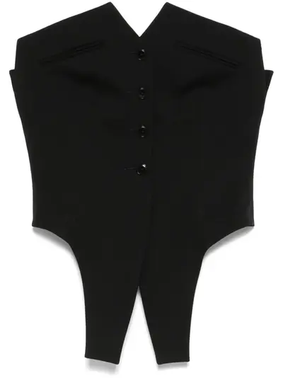 black front button fastening adjustable strap to the rear boned bodice dart detailing
