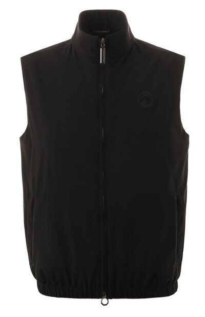 Жилет с эластичным поясом сшили из быстросохнущего полиэстера, защищающего от влаги и ветра. Модель с логотипом на воротнике-стойке и нашивкой с профилем королевского орла спереди дополнили боковыми карманами и внутренним с пуговицей.