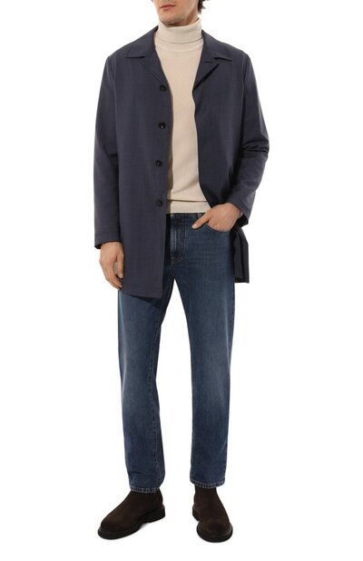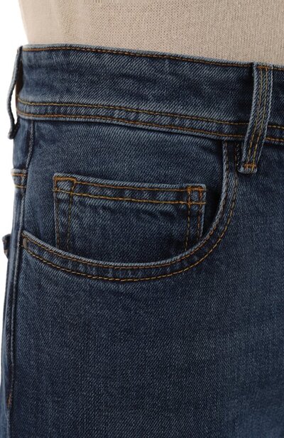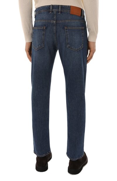 Для изготовления джинсов с пятью карманами использовали облегченный деним стрейч. Модель, прошитую табачной строчкой, украсили на поясе сзади брендированной нашивкой из кожи.