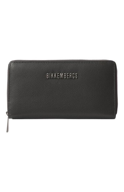 Кожаное портмоне с рельефным металлическим логотипом дополнили ремешком для удобного ношения в руке. Внутри аксессуара предусмотрели два отделения, держатель для ручки, карман на молнии, отделение для документов и карточные слоты.