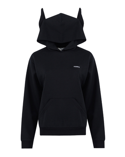 Это стильное худи черного цвета станет незаменимым элементом вашего гардероба, идеально подходя как для повседневной носки, так и для создания модных образов. Изготовленное из мягкого и приятного на ощупь материала, оно обеспечивает комфорт и тепло в прохладную погоду. Модель свободного силуэта предлагает свободу движений и расслабленный стиль, что делает её идеальной для активного образа жизни или уютных вечеров дома. Капюшон с оригинальными "рожками" добавляет игривый и креативный акцент, делая худи уникальным и запоминающимся. Логотип бренда, расположенный на груди, подчеркивает вашу приверженность к стилю и качеству. Он выполнен в контрастном цвете, что делает его заметным и придает изделию современный вид. Худи легко комбинируется с джинсами, леггинсами или спортивными брюками, создавая непринужденный образ для прогулок по городу или встреч с друзьями. Также его можно надеть поверх футболки или топа для создания многослойного стиля. С этим худи вы сможете выразить свою индивидуальность и добавить в свой образ нотку оригинальности и креативности!