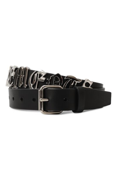 Регулируемый ремень средней ширины украсили металлическими деталями в виде логотипа бренда, выполненного в готическом стиле. Модель с одной шлевкой сшили из матовой кожи.