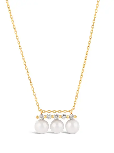 9kt yellow gold polished finish delicate chain statement pendant claw/prong setting round cut laboratory-grown diamond AAA grade freshwater pearls lobster claw fastening Pearls should be the last thing that you put on in the morning and the first thing you take off at night. Avoid contact with perfumes or creams, and simply wipe with a soft cloth to clean. Normal everyday use and external agents may reduce the lustre of gemstones and gold surfaces. To maintain, use specific, non-abrasive products specially meant for cleaning jewellery. Hallmarked in the United Kingdom at the London Assay Office.