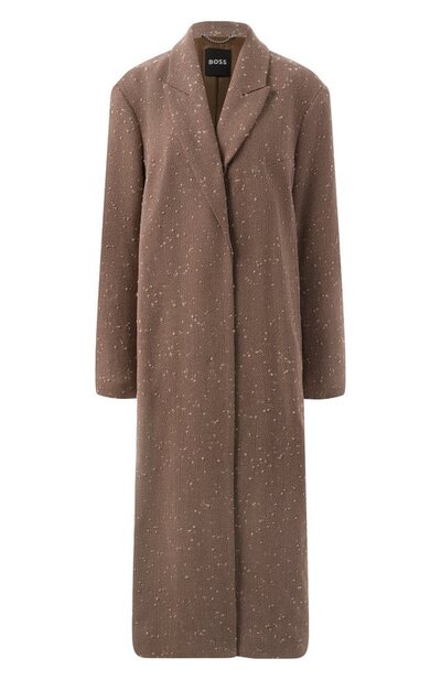 Шевронный узор на однобортном пальто дополнили горохом с твидовой фактурой. Модель с вискозным подкладом сшили из смесового текстиля на основе вторичного хлопка, шерсти и полиэстера. Сзади предусмотрели высокую шлицу. Изделие с боковыми и внутренним карманами застегивается потайными пуговицами.