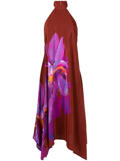 chestnut brown/multicolour silk floral print halterneck concealed rear zip fastening open back asymmetric hem