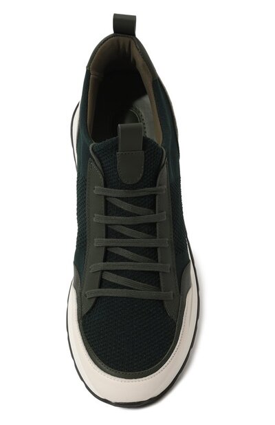 Мастера итальянской марки, основанной Стефано Риччи, использовали для создания кроссовок мягкий прочный трикотаж, который хорошо пропускает воздух и быстро отводит тепло от ног. Пару укрепили фигурными накладками из зеленой гладкой и белой зернистой кожи. Скульптурную подошву дополнили противоскользящим протектором.