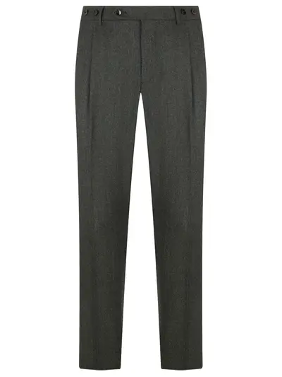 -Зеленые брюки из тонкой мягкой шерсти от BERWICH. -Модель полуприлегающего кроя со стандартной посадкой, защипами, поясом со шлевками, прорезными карманами, отворотами в нижней части брючин, застежкой на молнию и пуговицу.