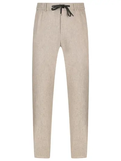 -Бежевые брюки из тонкой мягкой шерсти от BERWICH. -Модель полуприлегающего кроя со стандартной посадкой, поясом со шлевками и кулиской, прорезными карманами, застежкой на молнию и пуговицу, графичными стрелками, которые визуально вытягивают силуэт.
