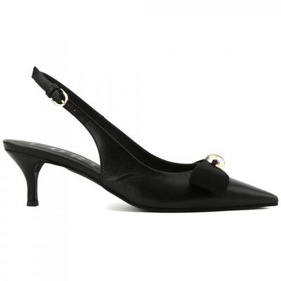 Босоножки FURLA из кожи в черном цвете. Изящные слингбэки выполнены из натуральной кожи классического черного цвета. Модель станет изящным дополнением образов для офиса. Пара украшена декором в виде текстильного банта со сферой из золотистого металла спереди. Ремешок с пряжкой фиксирует пару на ноге. Модель дополняет небольшой изящный каблук-шпилька.