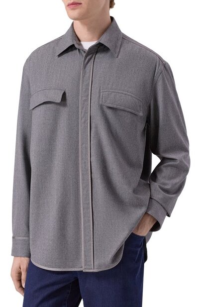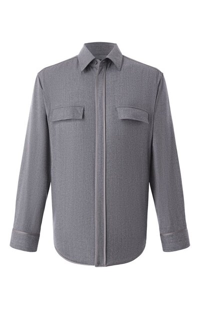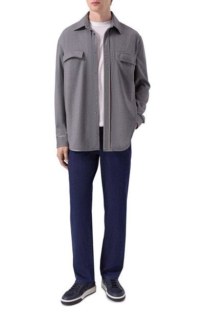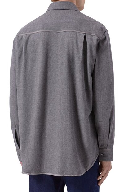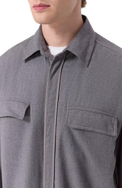 Детали кроя рубашки из шерсти первого острига подчеркнули узким шелковым кантом. Под кокеткой сзади заложили два защипа для большей свободы движений. Брендированные пуговицы из австралийского перламутра скрыли под планкой. Спереди — два кармана с клапанам.