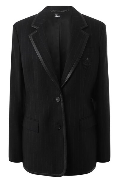 Однобортный приталенный жакет в меловую полоску сшили из шерсти с добавлением полиэстера. Модель с кантом из наппы дополнили тремя карманами, украсив нагрудный фирменной геральдической эмблемой.