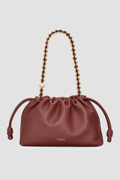 Сумка Flamenco Purse от LOEWE с просторным внутренним отделением. Модель изготовлена из мягкой кожи наппа и оснащена верхней частью на кулисках. Для удобства переноски в аксессуаре предусмотрены съёмные округлая ручка с металлическими кольцами золотого оттенка и анаграммой Pebble и тонкий регулируемый ремень на узлах. Атрибутами Дома являются золотистый логотип на лицевой стенке и брендирование во внутренней части.