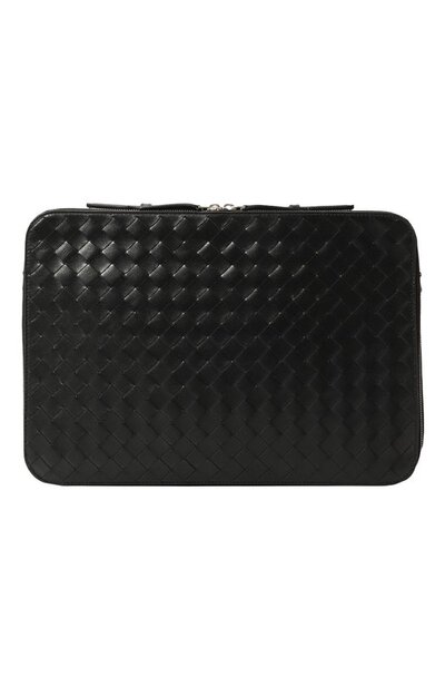 Сумку с короткой ручкой и съемным регулируемым плечевым ремнем сплели из телячьей кожи в технике intrecciato. Аксессуар, застегивающийся встречной молнией, дополнили отделением для ноутбука и тремя карманами.