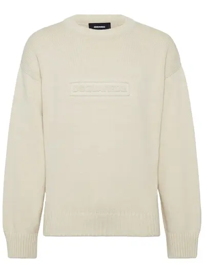 white cotton knitted construction crew neck embossed logo to the front drop shoulder long sleeves ribbed cuffs and hem