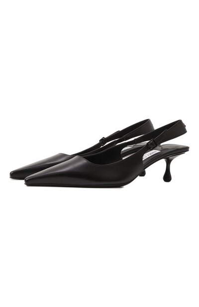 Остроносые туфли-лодочки Amel на скульптурном каблуке kitten heel выполнили из тонкой наппы. Слингбэки дополнили регулируемым ремешком с эластичной вставкой и пряжкой в тон сбоку. Сзади его украсили монограммой JC.