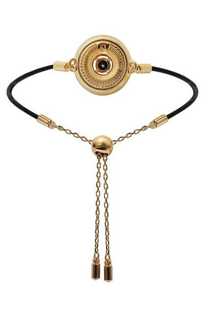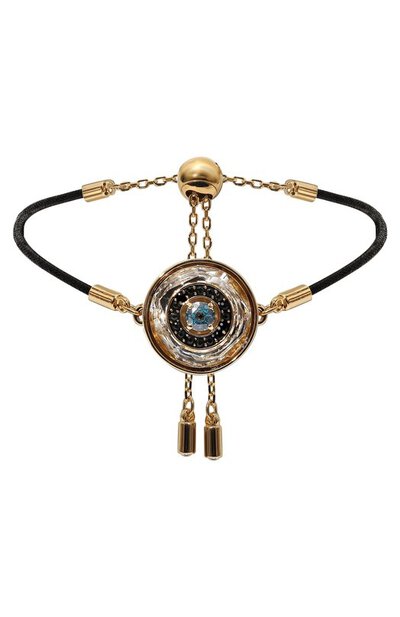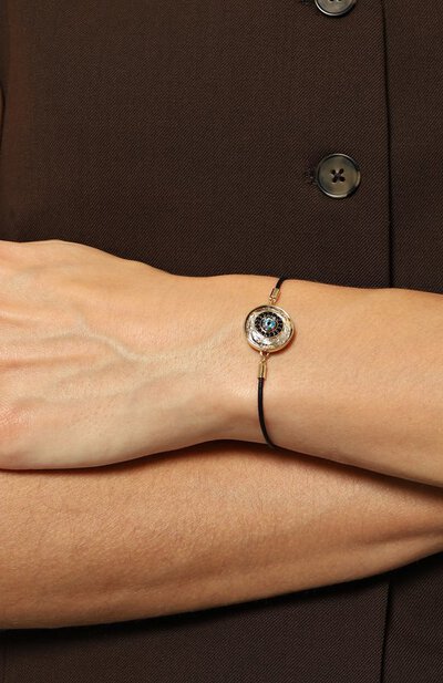 Браслет Symbolica с текстильными шнурами выполнен из латуни. В центре украшения расположен объемный шарм Evil eye с граненым кристаллом и паве. Посадка украшения регулируется скользящей застежкой.