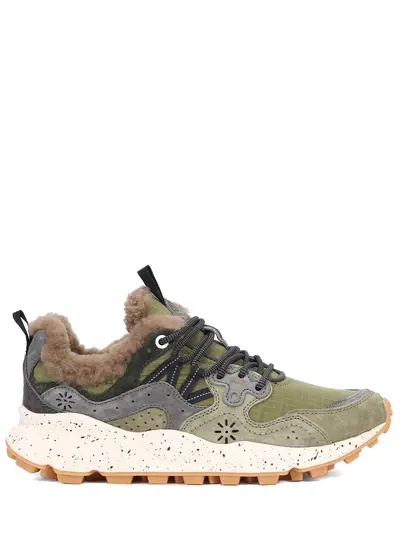 -Зеленые комбинированные кроссовки из текстиля и нубука от FLOWER MOUNTAIN. -Модель с прорезиненным мысом, функциональной шнуровкой, легкой подошвой с глубоким протектором, внутренней отделкой из овчины и текстиля.