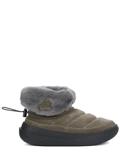 -Ботинки из бархатистой замши в зеленом оттенке хаки от FLOWER MOUNTAIN. -Стеганая пара с закругленным мысом, толстой резиновой подошвой, широким меховым отворотом, кулиской-утяжкой сзади, внутренней отделкой из меха.