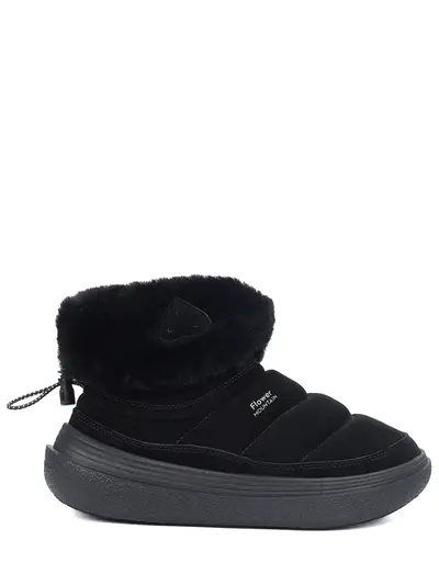 -Черные ботинки из бархатистой замши от FLOWER MOUNTAIN. -Стеганая пара с закругленным мысом, толстой резиновой подошвой, широким меховым отворотом, кулиской-утяжкой сзади, внутренней отделкой из меха.