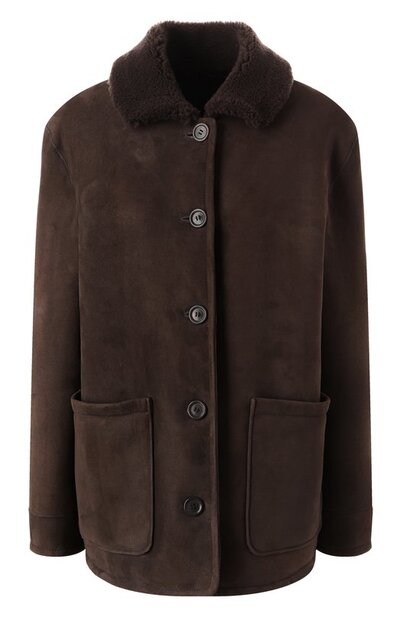 Дубленку сшили из овчины с замшевой лицевой стороной. Модель с меховым отложным воротником дополнили двумя накладными карманами. Изделие застегивается крупными пуговицами в тон.