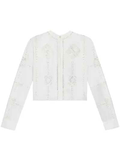 white cotton poplin texture broderie anglaise concealed front button fastening round neck long sleeves buttoned cuffs straight hem