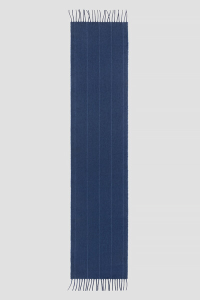 Синий шарф Brioni с полосатым геометрическим мотивом с одной из сторон. Классический аксессуар выполнен из мягкого трикотажа на основе кашемира и гладкого шёлка. Декором выступают вышитые надписи-лого Дома, короткая голубая бахрома по бокам и длинная - по узкому краю изделия.