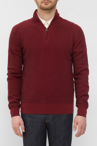 Вязаный свитер на короткой молнии сверху от Brioni. Модель изготовлена из мягкого трикотажа на основе шерсти и кашемира бордового оттенка. Изделие интересно наличием высокого воротника-стойки, выступающего дополнительным барьером для порывов ветра, а также широкого эластичного пояса и манжет-резинок для оптимальной посадки.