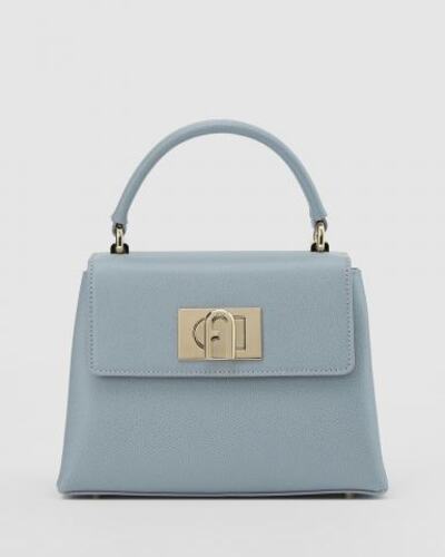 Сумка FURLA из кожи в голубом цвете. FURLA 1927 — мини-сумочка из фактурной кожи. Сумку также можно носить на теле благодаря съёмному ремешку. Поворотная застёжка с логотипом Arch спереди дополняет сумку. Открытый карман сзади. Металлические заклёпки, на дне сумки ножки из золотистого металла. Внутренняя складчатая конструкция с карманом на молнии.