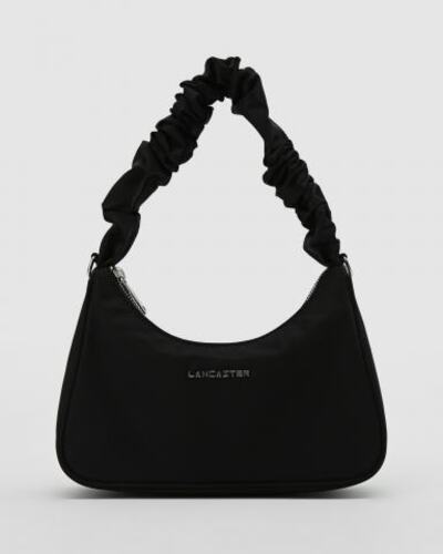 Текстильная сумка Lancaster в чёрном цвете. Ремень выполнен из ткани, собранной в стильную гармошку. Дополнительный ремень на плечо из текстильной ткани дополнен карабинами, на которые его можно пристегнуть к сумке. Застёжка на молнию, внутри фирменная подкладка и небольшой карман на молнии. О принадлежности к бренду сообщает металлический логотип Lancaster.