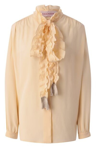 Блузу с прямоугольными манжетами и драпировкой, акцентирующей линию плеч, сшили из шелкового крепдешина. Модель дополнили воротником аскот, украшенным оборками и бахромой на концах.