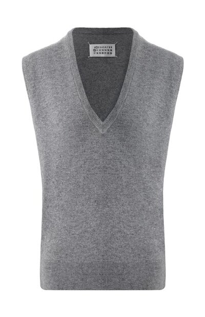 Жилет с широким поясом и кантом вдоль V-образной горловины выполнили из шерсти первого пострига. На спинке расположили фирменный штрих — четыре стежка.