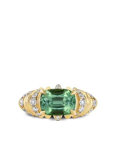 18kt yellow gold polished finish claw/prong-set emerald cut emerald channel-set round-cut white diamond concave band Normal everyday use and external agents may reduce the lustre of gemstones and gold surfaces. To maintain, use specific, non-abrasive products specially meant for cleaning jewellery.