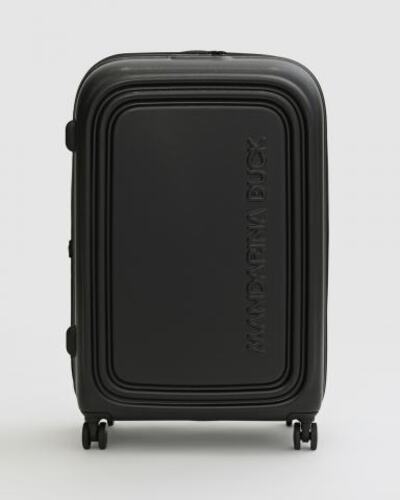 Чемодан в чёрном цвете Mandarina Duck. Компактный чемодан с корпусом из пластика в новом стильном дизайне. Корпус оснащён индивидуальной резиновой защитой от ударов и боковыми шипами против царапин. 4 двойных колеса обеспечивают мобильность, телескопическая ручка в закрытом состоянии лежит плоско, чтобы не увеличивать общий размер чемодана. Две дополнительные ручки из пластика расположены сверху и сбоку. Внутреннее отделение закрывается на надёжную двойную молнию, с кодовым замком TSA, который расположен сверху. Внутри идеально организованное пространство для всех Ваших вещей: два отделения, карманы на молниях, ремни для крепления багажа.