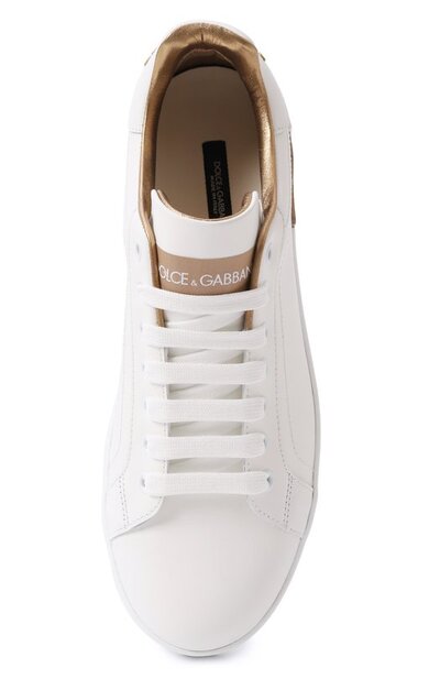 Доменико Дольче и Стефано Габбана разнообразили белые кеды Portofino из осенне-зимней коллекции 2020 года золотистыми акцентами, но не лишили пару из матовой наппы универсальности. На каблуке мерцает накладка из материала с тиснением Dauphine. На нем резиновыми буквами, созданными методом инжекционного макролитья, выложили логотип марки. Его продублировали под вырезом и на патче язычка.