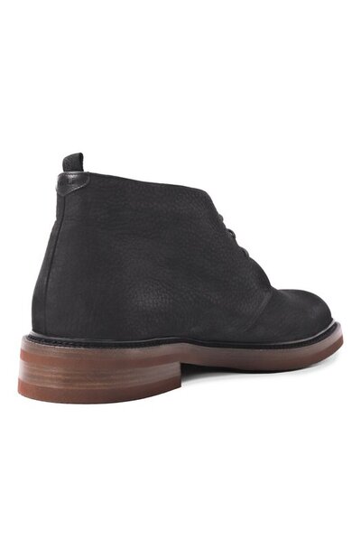 Ботинки с наборным каблуком выполнили из зернистого нубука, а для внутренней отделки использовали овчину. Задник дополнили брендированными кожаной нашивкой и текстильной петлей.